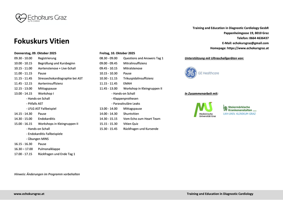 Der Fokuskurs Vitien setzt grundlegende Kenntnisse zum Thema Echokardiographie voraus. Thematisch werden alle relevanten Vitien besprochen und Methoden zur Quantifizierung vorgestellt. Bei den Kleingruppenübungen bzw. Trainings werden diese dann an eingeladenen Patient:innen und anhand von Fallbeispielen beübt. Am Ende des Kurses sollten Teilnehmer:innen in der Lage sein Vitien korrekt zu quantifizieren und dabei gängige Fehlerquellen vermeiden.