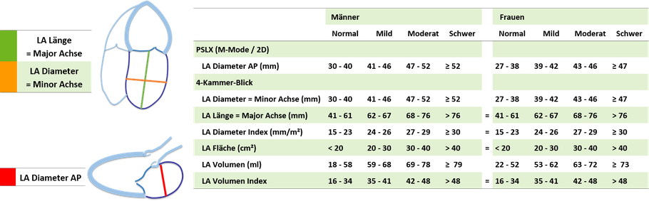 Quantifizierungsmethoden und Normalwerte zum linken Vorhof sind in den Leitlinien zur Quantifizierung der Herzkammern von Lang et. al. (2015 JASE) dargestellt. Normwertebereiche definieren sich aus Daten der Framingam-Studie (Vasan et. al. Circulation 1997)