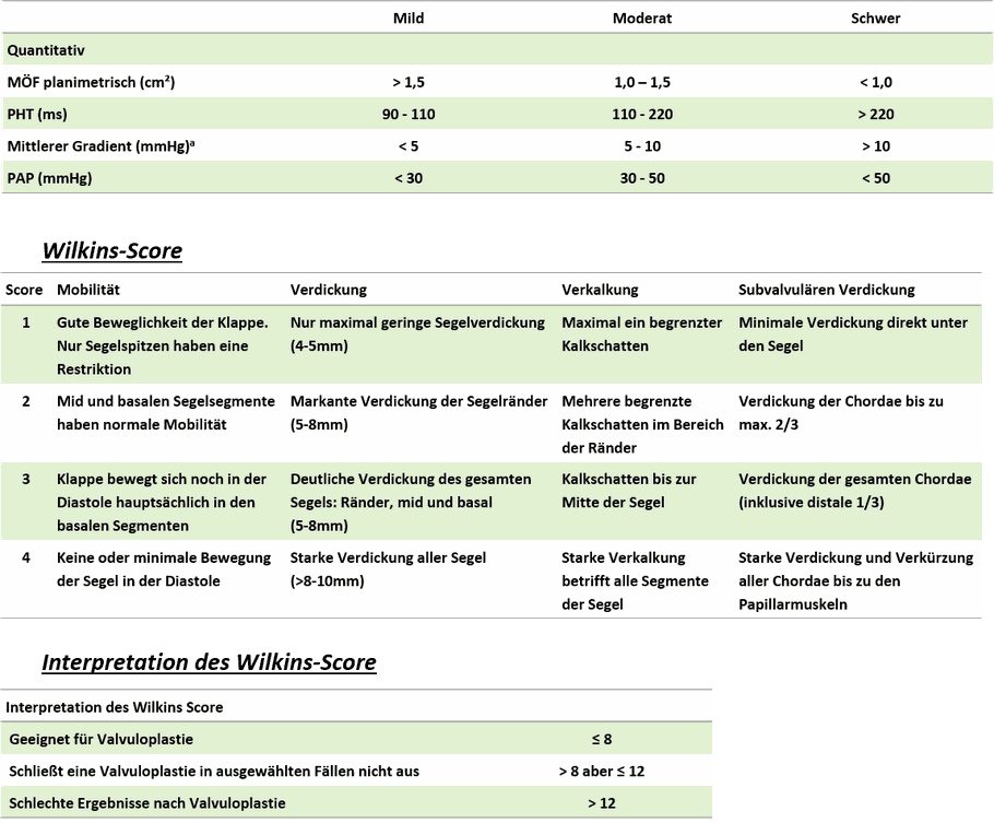 Eine detaillierte Beschreibung zur Evaluierung und Quantifizierung einer Mitralstenose mittels transthorakaler Echokardiographie findet sich in der Leitlinie von Baumgartner et. al. (Eur. J. Echocardiogr. 2009). Wichtiger in diesem Zusammenhang stellt die rezentere Leitlinie zur Abklärung und Therapie von Herzklappenerkrankungen dar (Praz et. al. Eur. Heart J. 2025).