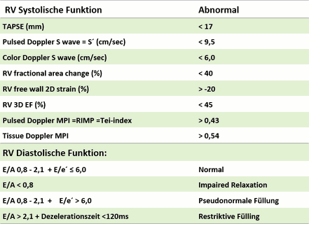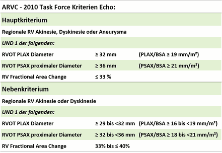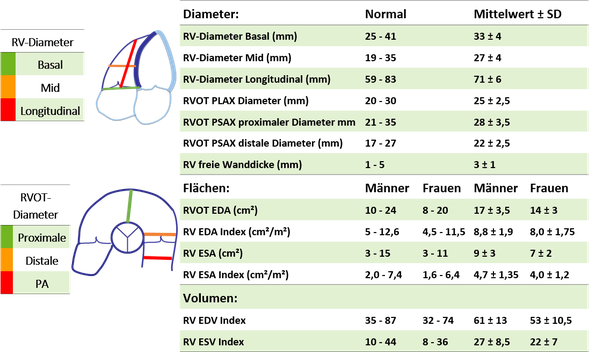 Allgemeine Informationen zum rechten Ventrikel finden sich in der Leitlinie zur Quantifizierung der Herzkammern von Lang et. al. (JASE 2015). Zusätzlich existiert eine eigene auf die rechte Herzseite fokussierte Leitlinie von Rudsky et. al. (JASE 2010). Diagnostische Kriterien zur ARVC sind von Marcus et. al. (Circulation 2010) beschrieben.